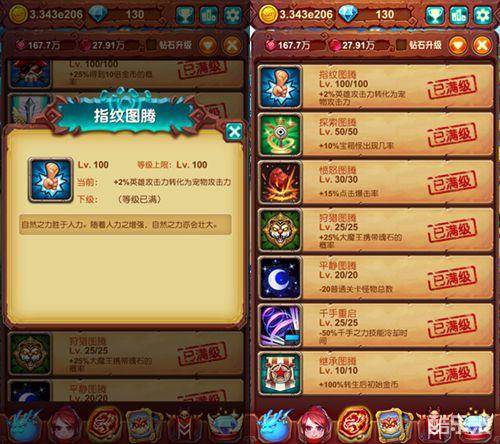 比如“指纹图腾”,可以将勇者本身的攻击力按照百分比转化成宠物的攻击力!众所周知,在游戏中,我们点击屏幕触发的是宠物们的攻击,一旦宠物的攻击力上升,那我们闯关的速度将大幅度增加!而“指纹图腾”的存在可以使一直默默帮助勇者们的宠物们瞬间攻击力爆棚,成为强有力的助力!