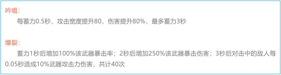 蓄力1秒后增加100%该武器暴击率;2秒后增加250%该武器暴击伤害;3秒后对击中的敌人每0.05秒造成10%武器攻击力伤害,共计40次