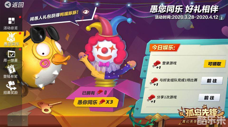 为庆祝即将到来的愚人节,3月28日至4月12日期间,《孤岛先锋》开启“愚您同乐”主题活动,玩家完成每日任务可获得小丑拳套,消耗一定数量的拳套可兑换抽奖杨会。奖池中包括大量秘宝钥匙、金钥匙、赛季宝箱十连抽7折券、随机天赋书、英雄能量、钻石、金币等珍贵奖励,更有变身宠物愚乐主题皮肤“鸭嘴豚豚”,陪伴玩家足不出户体验