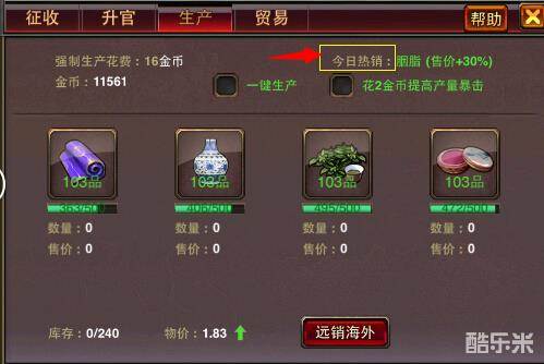 累积生产商品会提高自身的商品品质,品质越高出售价格就越高,所以每天都不要忘记去作坊逛一逛。当然每天商品价格也都是不一定的,如果热销商品又是高价商品,那么你就赚翻咯!