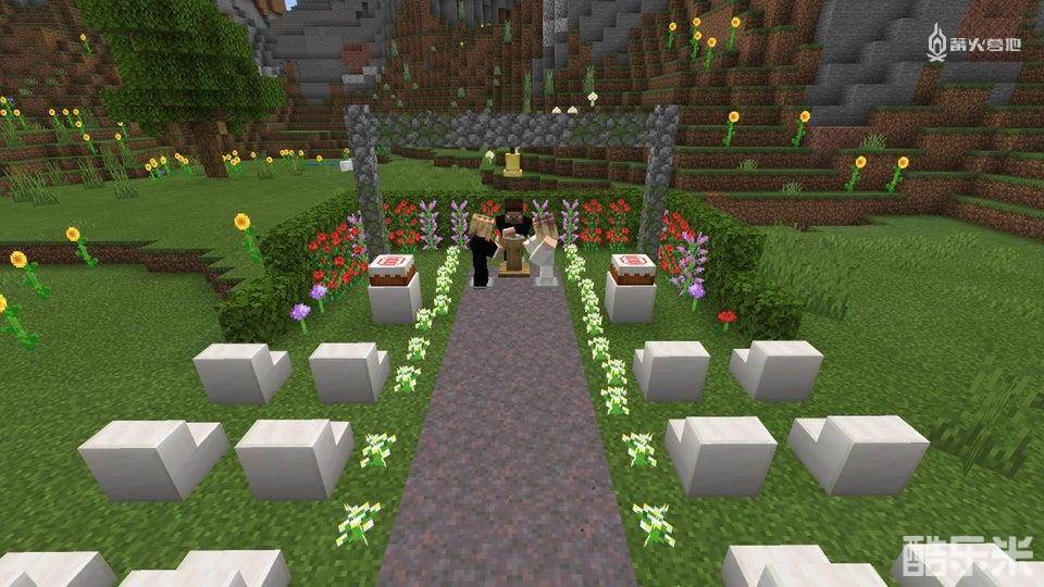 甚至,你还能在《我的世界》中实现一场浪漫的求婚或者举办一场理想中的完美婚礼,从选址、教堂的建造到每一张桌椅的摆放位置等所有细节都由玩家亲手完成: