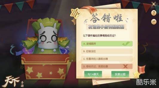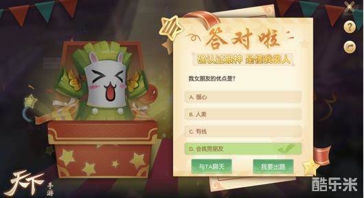 想测试与亲友的默契值吗?想给情缘来一发地狱级送命题吗?《天下》手游“愚你同乐”活动题库已为少侠备好,只等你来勾选正确答案!自选问题并勾选你心中的正确答案,发送给亲友等TA猜出你的选择。回答正确即有机会获得雷音溟钻、元魂精魄等好礼,回答错误则会有搞怪小惩罚!本次“愚你同乐”活动还将特别增加愚人节趣味评语,官方吐槽,最为致命!想GET愚人节官方点评吗,那就快来互送送命题吧!