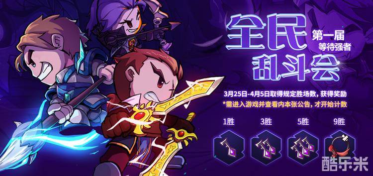 3月25日-4月5日,第一届乱斗会等强者现身!活动期间,全服 匹配乱斗模式并获得规定胜场数,将获得相应头像框、宝箱钥匙奖励。 玩家们在游戏内打开本公告时,计数就已开始(没有看公告就不能计入胜场数哦)!