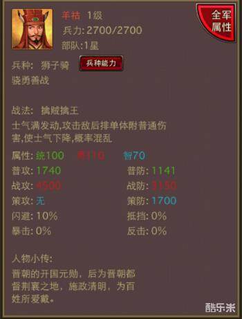 羊祜游戏中很少有人会用到,因为牵起你推图相对来说比较简单,玩家对排兵布阵不需要花费太多精力,中期建议可以招募并且训练,因为他能打后排,对于推图帮助是比较大的,选择武将不要片面无脑地拿战法将,一定要记住哈!