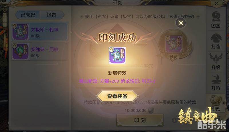 《镇魔曲》逍遥城新赛季里,天命者们用于全面提升实力的玄佩获得的全新“印刻”功能,将为天命者们带来更多特效加成。只要消耗不同的玄咒或极咒,就能在相应部位的玄佩上附加物资或双特效,参天、金刚不灭、利刃、真龙心甲等多种强力效果,运气爆表的天命者还能用不同的玄咒合出极咒、收获更强特效,新赛季新征程,对决取胜更轻松!