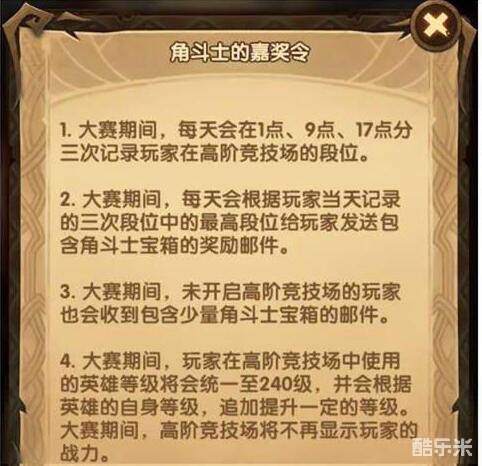 活动期间,高阶竞技场玩家等级统一提升至240级以上,并根据英雄等级少量再次提高。大概是每10级提高1级。
