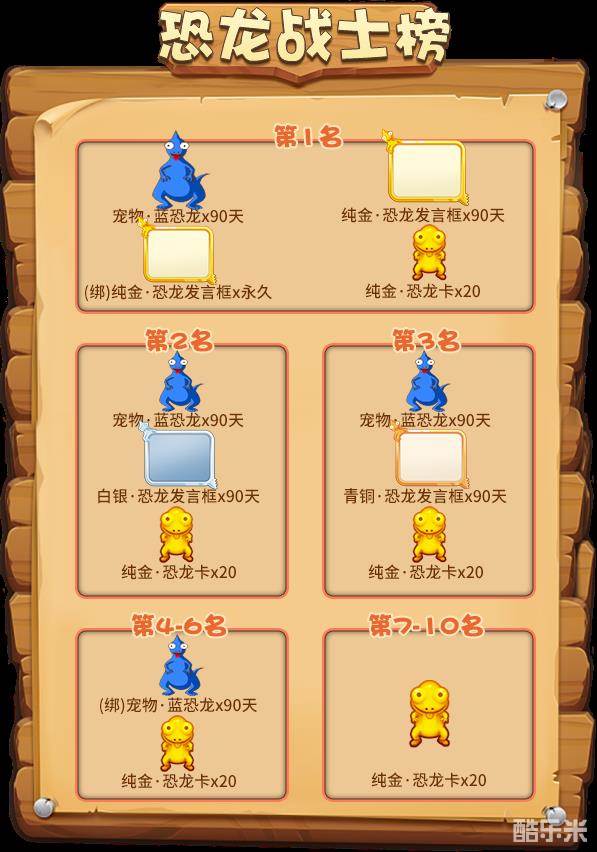 活动结束后,累计接收非绑定“恐龙卡”最多的前十位玩家,将成为“最强恐龙战士”,获得排行榜奖励!