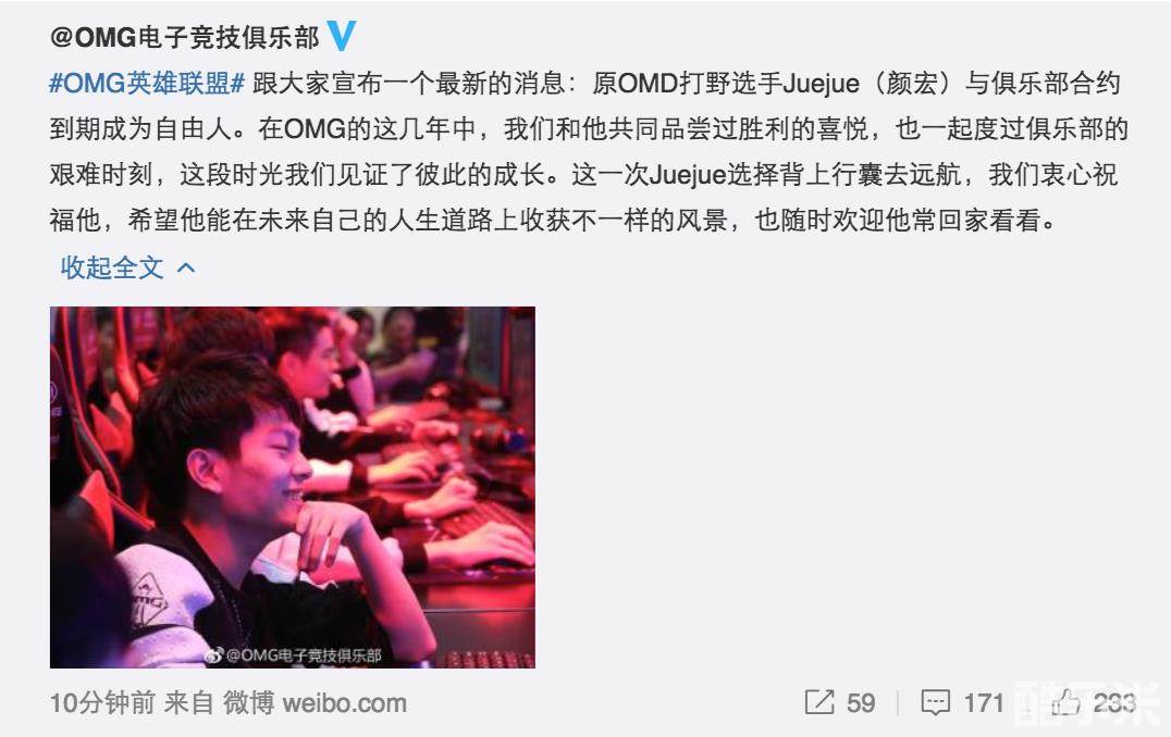 OMG官方微博发布消息:原OMD打野选手Juejue(颜宏)与俱乐部合约到期成为自由人。在OMG的这几年中,我们和他共同品尝过胜利的喜悦,也一起度过俱乐部的艰难时刻,这段时光我们见证了彼此的成长。这一次Juejue选择背上行囊去远航,我们衷心祝福他,希望他能在未来自己的人生道路上收获不一样的风景,也随时欢迎他常回家看看。