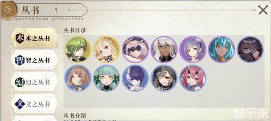 丛书一共有五类,分别是文神幻术智。一位幻书角色拥有1~2种丛书类别。