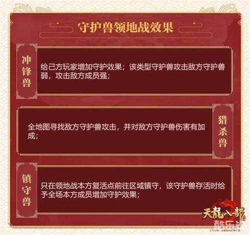 在此次更新中,还有一个全新的功能率先于先锋服内开放体验,这就是帮会守护兽功能。帮会守护兽分为冲锋兽、猎杀兽以及镇守兽三种类型守护兽,这些守护兽需要集合全帮会的力量来进行喂养。当然它们的实力也绝对不容小觑,这些守护兽可以在帮会的领地争夺战中参战,并且根据不同类型守护兽的战斗特点,为帮会带来不同的增益效果。譬如镇守兽可镇守在己方营地前,并给予全场己方成员夺旗速度提升15%和每隔30秒回复血量的守护效果,当己方守护兽死亡时,该守护效果消失。