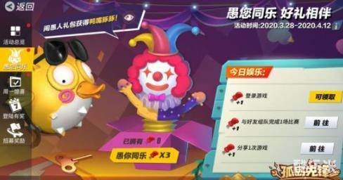 为庆祝即将到来的愚人节,3月28日至4月12日期间,《孤岛先锋》开启“愚您同乐”主题活动,玩家完成每日任务可获得小丑拳套,消耗一定数量的拳套可兑换抽奖杨会。奖池中包括大量秘宝钥匙、金钥匙、赛季宝箱十连抽7折券、随机天赋书、英雄能量、钻石、金币等珍贵奖励,更有变身宠物愚乐主题皮肤“鸭嘴豚豚”,陪伴玩家足不出户体验 “春江水暖鸭先知”“正是河豚欲上时”的好风光。