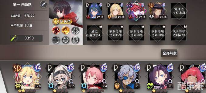 这是我用送的十连抽完的队伍,在把一个高星卡和几个顺眼的角色升到15级之后我发现一个尴尬的问题,就是我卡关了我发现想升战力到更高级需要推主线,推主线就需要更高的角色战力。