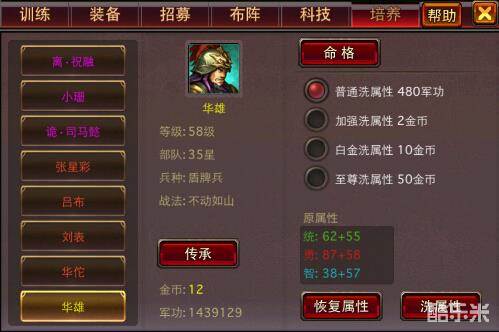 满属性为武将当前等级加20,军工理论可以将一个属性洗满,但是天文数字,2金不建议,10金一直洗可以让单属性满其他两种半满,三洗必须50金。