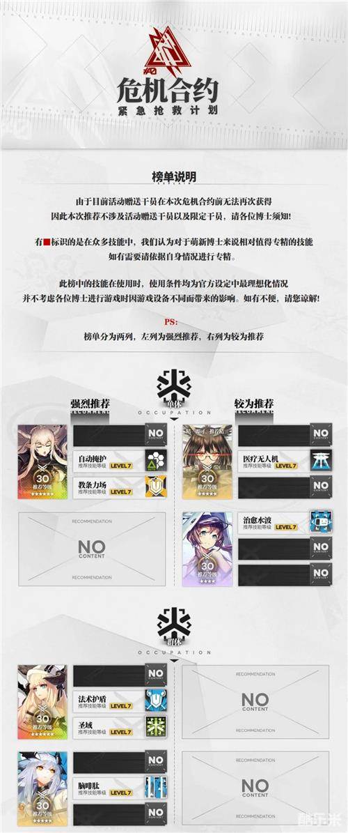 此急救榜仅供参考,而且处于同一级别的干员之间的排序不分先后,希望各位博士从自身实际情况出发,纵览全局,按需培养。最终情况请以实际为准,在此预祝各位博士在本次危机合约中都能取得令自己满意的成绩。