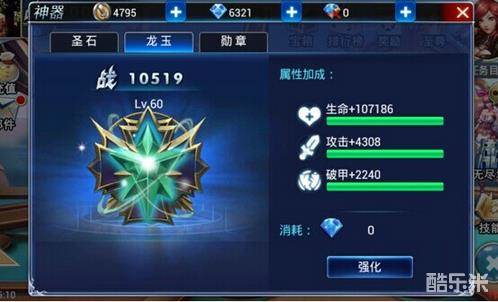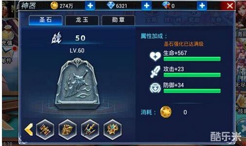 1、 圣石:满级60级,总共加战斗力2098,使用金币强化。虽然说前期金币很紧缺,但是到了中后期,金币来源途径广泛,非常充裕,前期大家可以去完成金币副本,来强化圣石,冲排行玩家必须要做,第一个神器满级可以说无压力。