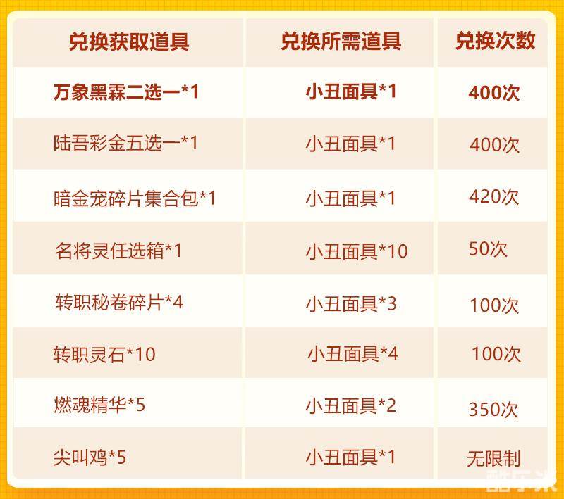 「小丑面具」可兑换万象黑霖二选一、陆吾彩金五选一、暗金宠碎片集合包、尖叫鸡等资源: