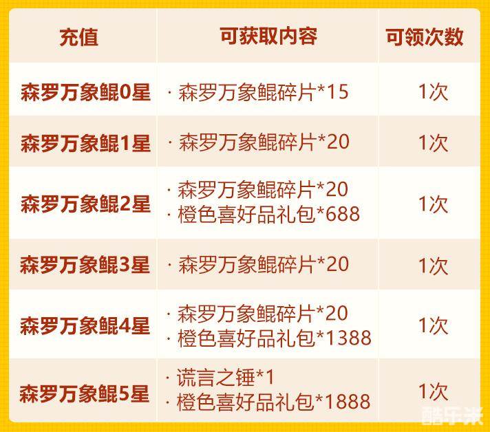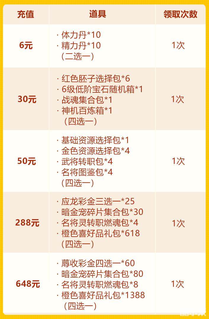少年们单笔充值指定金额,即可得到蓐收彩金四选一、暗金宠碎片集合包、名将灵转职燃魂包、橙色喜好品礼包等珍稀道具!并且可以和欢庆佳节中的充值活动叠加,少年们千万不要错过哟~