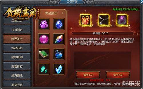 相关玩法,其实上面已经说得很清楚,可以将幸运鉴定,看成一个迷你寻宝,花费一定的元宝去抽部分奖励,当达到125点祝福值的时候,神秘大奖等着你。,其实也不神秘了,就头顶的那几件奖励。当然如果你运气好,一发入魂当小编说废话就行,另外本周活动也非常精彩,大家一起来看看吧~