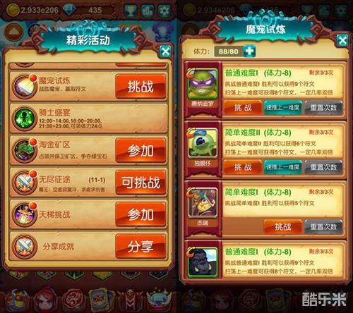 除了每日签到这类直接领取的资源外,还有每天的“骑士盛宴”也同样对勇者们十分重要,勇者们想要进行魔宠试炼就必须要有一定的体力。而每天12点18点21点都可以通过盛宴直接领取24点体力!有了这些体力,大家完全可以再去为我们的魔宠伙伴锻炼一翻!争取早日成神!