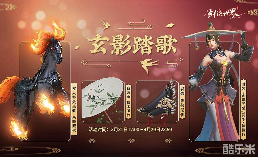 全新外观活动“玲珑宝匣”闪亮登场。活动时间内,点击头像下“玲珑宝匣”活动图标可打开活动界面参与活动获得丰厚奖励。本期外观奖励包括:双人特效坐骑·焱睛照夜、双人特效坐骑·飏影逾辉、动作特效挂件·松雀玉竹、时装玄影无忌·至臻、玄影无忌·奇巧、玄影无忌、发型慷慨行·至臻、慷慨行、腰饰唯侠无忧·奇巧、唯侠无忧。