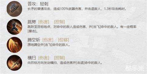2、跳劈:输出技能。简单来说,玩家将通过跳跃的方式进入目标地带,进而击飞周围的范围目标。同时,期间可提供较强的暴击效果;