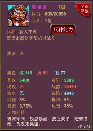 煞·董卓在游戏中是一名野将,在游戏中可以做普攻将来培养,因为自身统属性最高,如果武将升级到顶,并且装备附属全部洗练出普通攻击的话,可以发挥出非比寻常的威力。