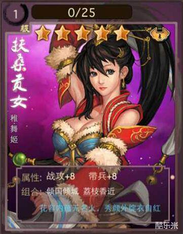 稚舞姬在游戏里面是最高5星级秀女,自带属性:战攻、带兵,可搭配组合“倾国倾城”、“荔枝香近”,有着“花容内蕴无名火、秀颜外绽衣自红”之称!