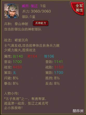 作为五子良将之一,威烈·张辽的各项基础属性都相当出色,是一般玩家的必备之选,其属性:统140