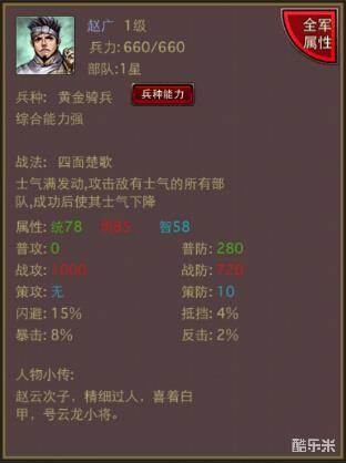 战法介绍:士气满发动,攻击敌有士气的所有部队,成功后使其士气下降