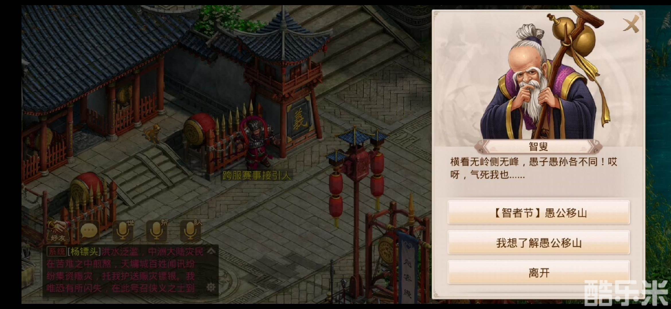 大于等于30级且活跃度达到50的两个角色组队前往天墉城-智叟处参加智者节活动,在了解事情的来龙去脉后,双方选择结束获得道行或经验奖励,便可以开始移山对决啦。