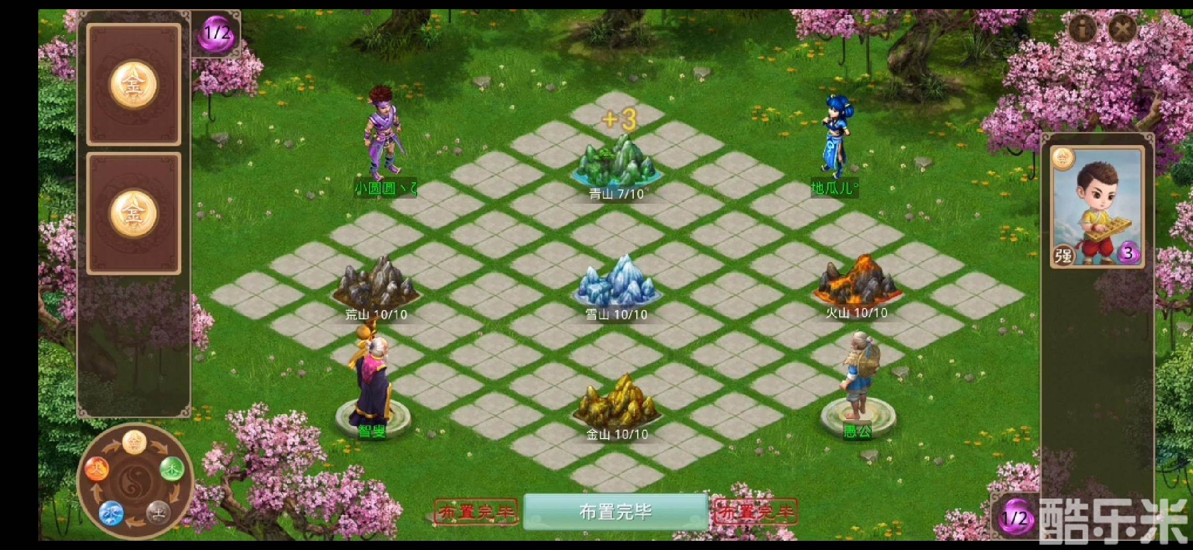 智叟方掌握五行“术牌”,依据对“人牌”的五行相克关系使用。若在同一处高山的“术牌”对“人牌”为克制关系,比如在青山上存在金属性“人牌”和火属性“术牌”,则人牌不会生效,同时会为场上耐久最少的高山回复1-3点耐久。每回合最多只能对每座高山使用一张“术牌”。双方可以根据对方拥有和已使用卡牌的属性,来预测卡牌放置的位置。