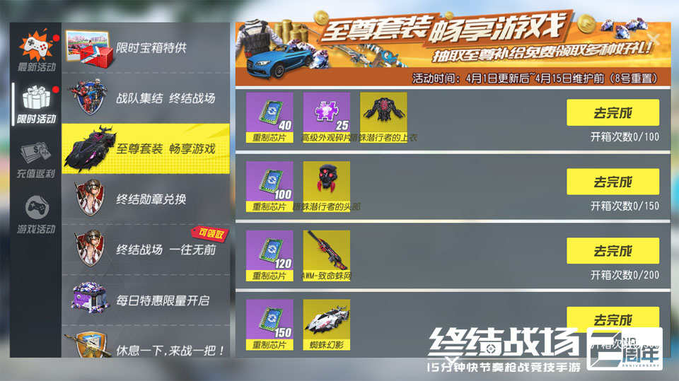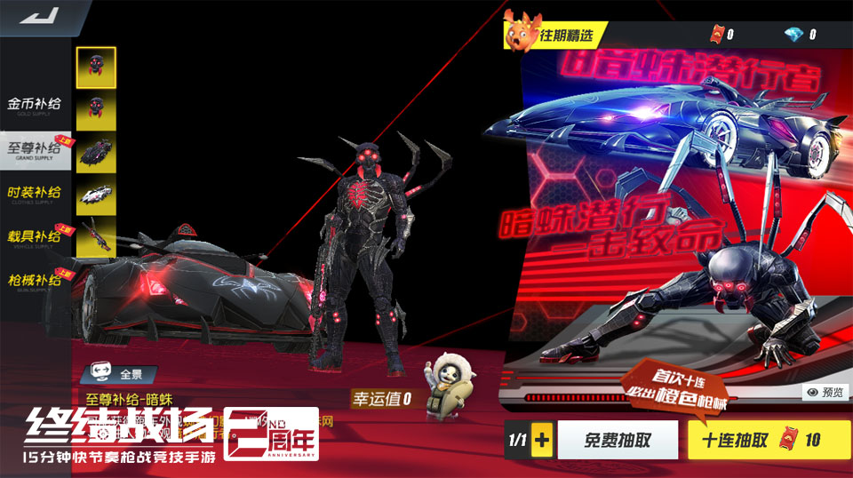 抽取至尊补给达到一定次数后,玩家还可以在至尊套装兑换活动中直接领取相应奖励。这里同样拥有跑车外观蜘蛛幻影、AWM外观致命蛛网、男性人物外观暗蛛潜行者和海量金币、重制芯片、高级外观碎片等实用道具,是补充小金库与外观的必选之地。