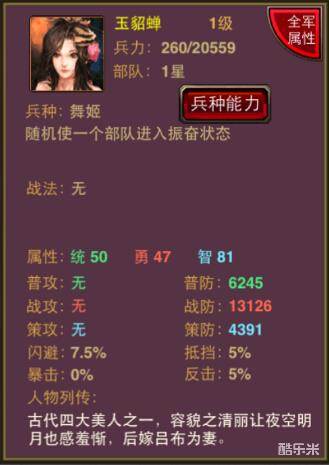 玉貂蝉和以前的伏·皇后作用一样,都是随机满士气鼓舞一个战法部队,但是各项基本属性都要比其他舞低,建议非R和小R玩家朋友们使用,且不谈防御系数了,作用完全一样,非R玩家可以和充值玩家走一样的游戏模式,这样才有助于新区的发展噢!
