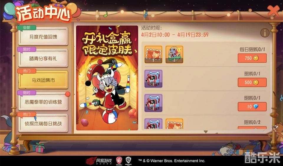 为观众带去快乐,是小丑的最大愿望,但在猫鼠追逐中,恶魔泰菲·小丑王除了要为玩家们带来欢笑外,也要用独特的滑稽戏战胜猫咪,赢得比赛!4月2日至19日,马戏团集市将限时开业,玩家们可选购超值好礼或小丑王皮肤礼盒,礼盒必出小丑王皮肤碎片,且有几率直接获取该皮肤。