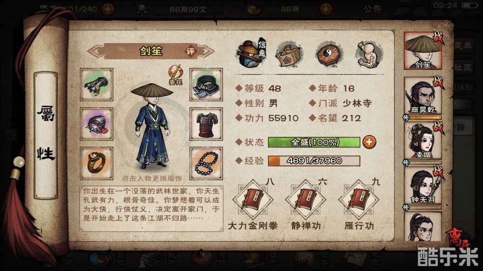 首先我们进入游戏出身选择行侠仗义是比较好的,主角如果你不知道玩什么就选男性和少林寺,因为武功、秘籍都非常多,大家可以随意挑选,但要是你想玩个女角色可以选择天刀、泠月。