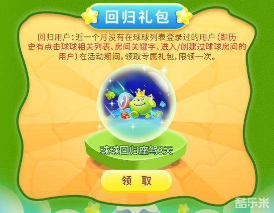 活动给回归的玩家送了一个“球球回归座驾3天”,要求是近一个月没有在球球列表登录过的用户(即历史有点击球球相关列表、房间关键字、进入/创建过球球房间的用户),老玩家回归牌面还是要守住滴。