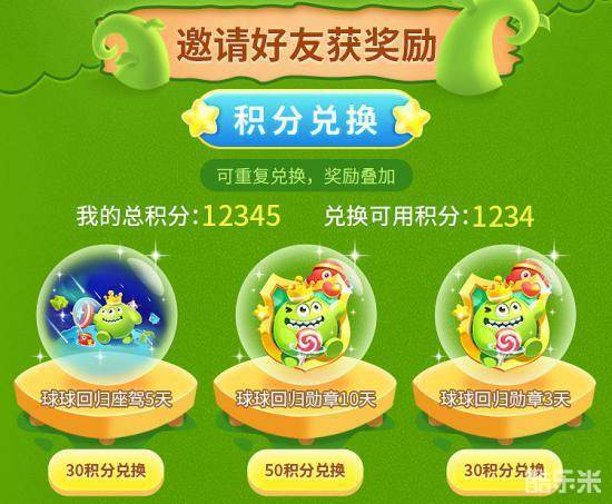 积分兑换我建议换“球球回归座驾5天”30积分,换6次;“球球回归勋章10天”50积分,换3次;累计消耗330积分就可以免费各用30天,一个月的牌面呐!