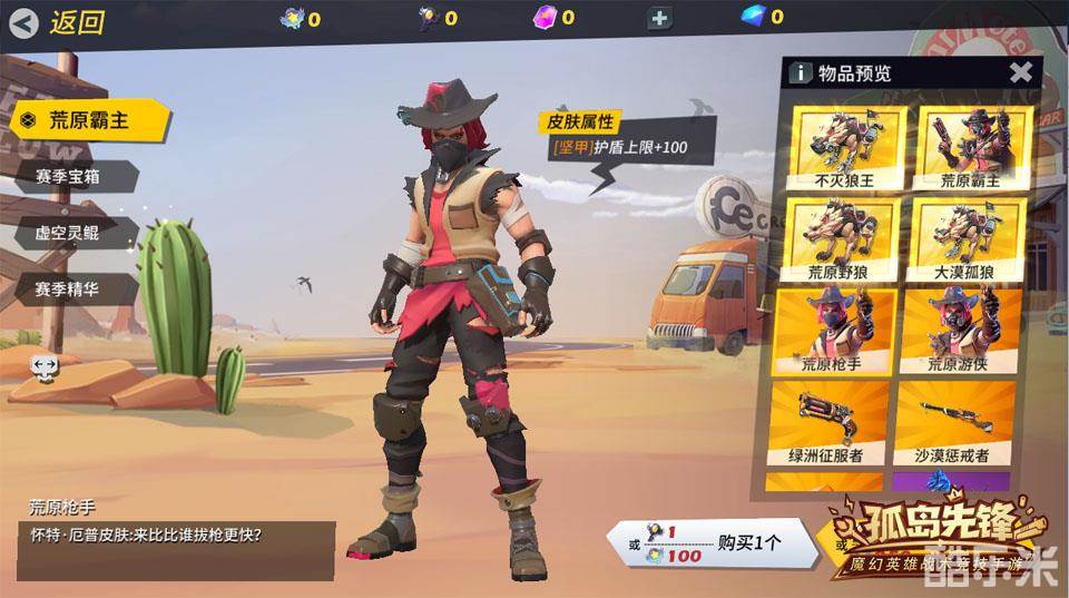 玩家开启宝箱后即有机会获得荒原主题可升级皮肤:荒原枪手、荒原游侠、荒原霸主。从初入荒原的流浪枪手,到独霸一方的荒原霸主,该套皮肤将游侠浪子的独特气质展现得淋漓尽致。