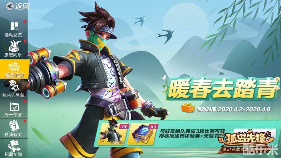 四月正是春游时,尽管暂时无法出门尽享出行的快乐,却同样可以与好友在游戏中结伴 “踏青”。4月2日至4月8日期间,玩家可以与任意好友组队,只需完成3场比赛即可领取穿云猎隼皮肤“巷尾涂鸦”体验券以及英雄天赋书等奖励。