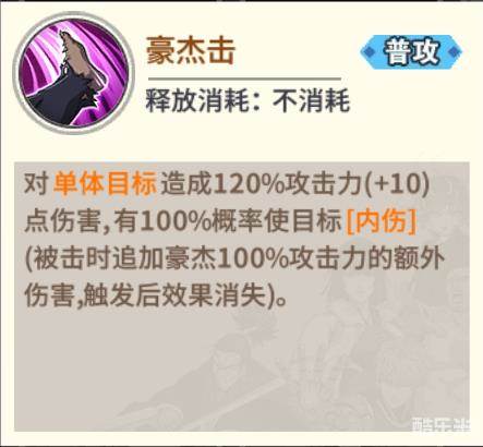 [豪杰击]普攻即会造成100%的内伤效果,算上基础伤害120%攻击力系数,是当前版本中造成最高伤害的普攻之一,配合僵尸男核心,既可以回复能量,也可以触发绝技伤害持续提升的效果。