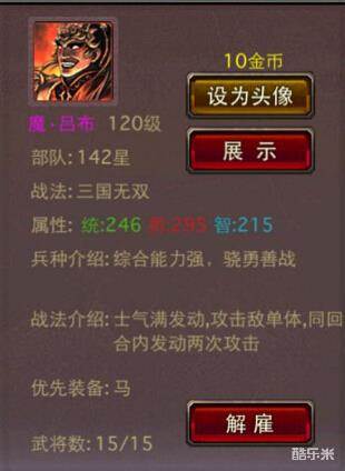 魔·吕布在游戏中是一名战法将,战法将主要看中战法和披风的品质,所以和其他的战法将一样,魔吕也是战法为主,最好是紫色属相战帝释。