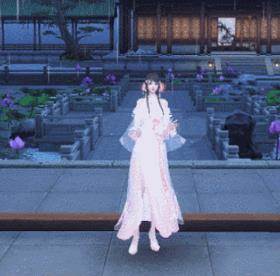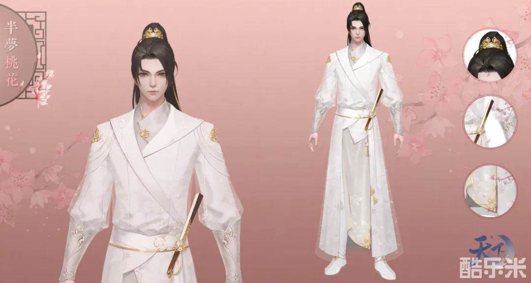 桃之夭夭,灼灼其华。《天下3》春日百花盛开,桃花自然也不甘示弱。趁此观赏桃花的最佳时节,少侠不妨换上这身最新时装“半梦桃花”,化身桃花仙子,静默赏花也能自成一道风景线!古代仕女喜将簪花作为饰品戴在头上,“半梦桃花”女款便将灼灼桃花簪于双垂髻上,辅以金箔流苏,清丽婀娜,顾盼生姿。衣裙以清代旗袍为基础式样,桃花色裙袂与袖口的桃花暗纹相得益彰,突显大家闺秀的端庄;衣袖则为颇具现代感的半透明薄纱露肩款,增添几分轻盈与灵动。