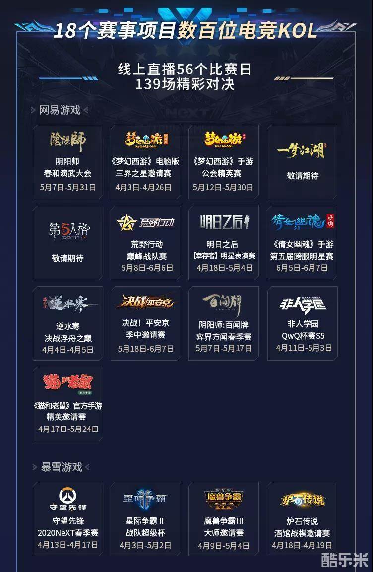 赛事集结了《梦幻西游》电脑版、《梦幻西游》手游、《阴阳师》、《决战!平安京》、《阴阳师:百闻牌》、《一梦江湖》、《荒野行动》、《明日之后》、《倩女幽魂》手游、《逆水寒》、《猫和老鼠》官方手游、《非人学园》、《守望先锋》、《星际争霸Ⅱ》、《魔兽争霸Ⅲ》、《炉石传说》等10余款网易及暴雪旗下人气佳作及经典旗舰,新赛季新起点,全面焕新,更竞一步。