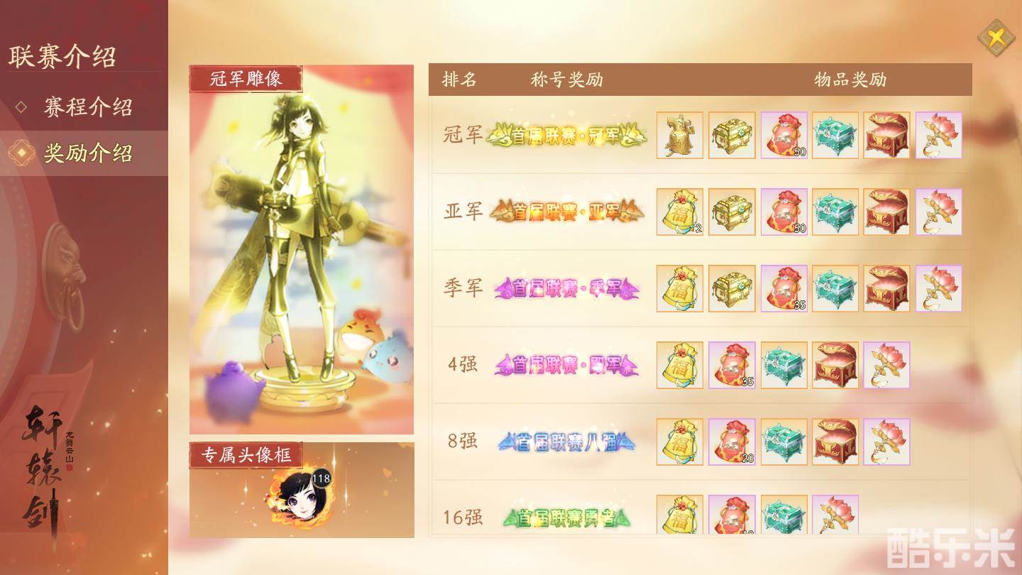 而参赛战队将会根据比赛名次获得稀有物品、称号奖励、专属头像框、专属宝器、专属鞍座、高级定制奖杯等奖励,冠军队伍还会在全部服务器内设立联赛冠军雕像,尽享至高荣誉!