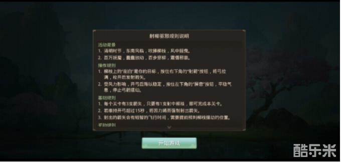 开始射柳游戏,面前会有柳枝随风摆动,道友们瞄准柳枝上白色的一段,射中柳枝即视为本关成功。每关会有三支箭矢,只需要成功射中一次就可以过关。
