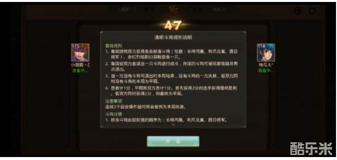 道友们对对手出牌的进行预测,然后制定策略派出合适斗鸡战斗。最终没有斗鸡可派出的一方本局失败,胜者获得一分。若双方都没有斗鸡可以派出则为平局,各获得一分。率先获得两分的一方获得最终胜利,若同时获得两分,则最终结果为平局。