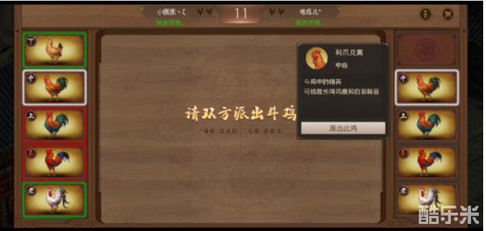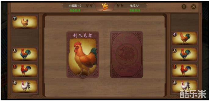 每局双方各出一只斗鸡,选择完毕同时显示所派出的斗鸡,根据斗鸡之间的强弱关系,被克制的斗鸡消失,存活的斗鸡回到手牌中可继续参战。