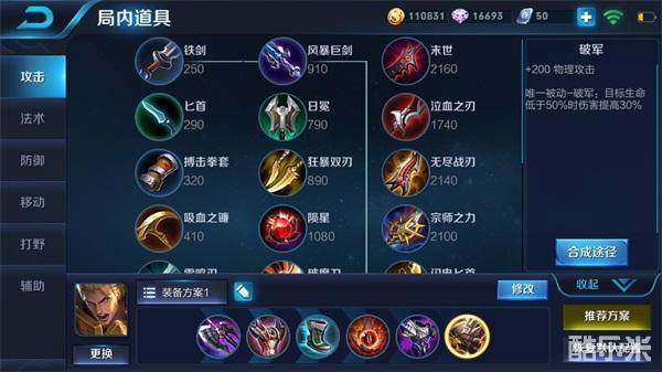 建议出装:暗影战斧、暴烈之甲、冷静之靴、血魔之怒、霸者重装、破军