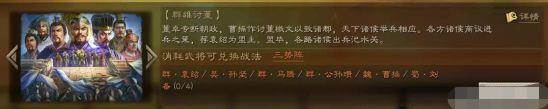 这个战法是6选4武将,可以四个不同诸侯,也可以两个袁绍、两个马腾或者四个马腾都可以兑换。现在已经稳定开发出了三势阵吕布、三势阵贾诩的组合,其他武将组合还在观望中。