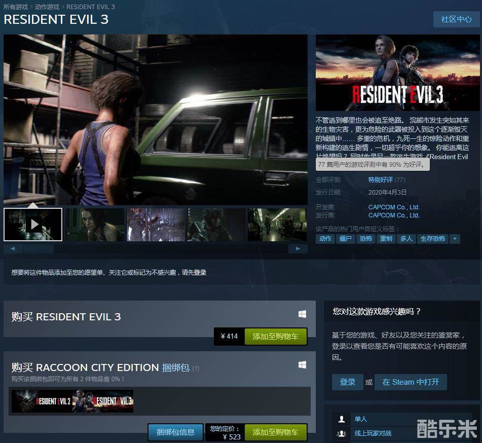 今日(4月3日)《生化危机3:重制版》在Steam上正式发售,游戏售价414元,支持中文。目前Steam上总评为“特别好评”,90%的好评率。有老玩家表示该作勾起了童年回忆,还有人大呼真香,神优化,吉尔好美!